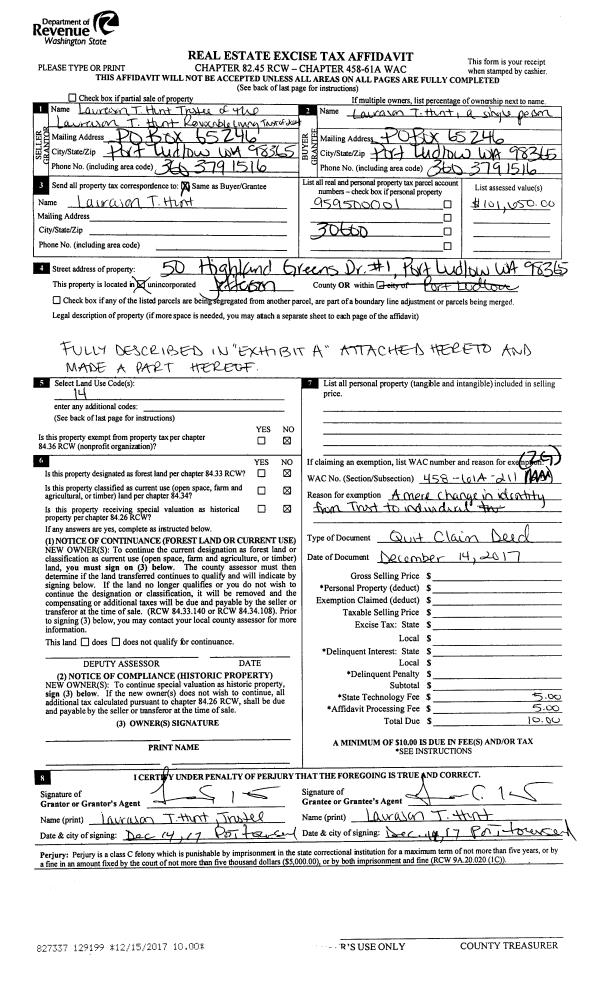 | 2 | 12/14/2017 | QCD | Quit Claim Deed | LAURASON T HUNT | LAURASON HUNT | | | | 129199 | |