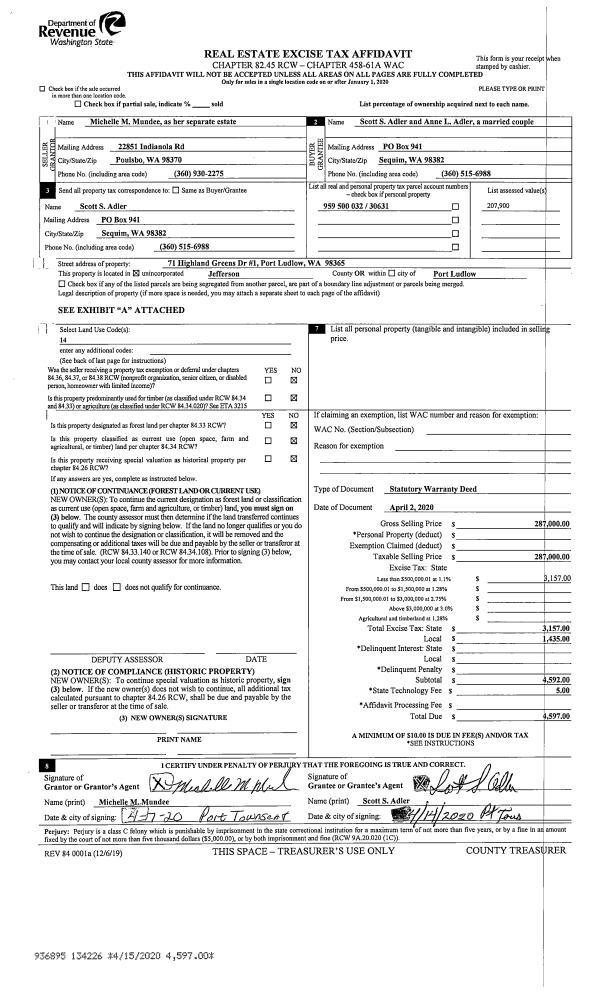 | 2 | 04/02/2020 | SWD | Statutory Warranty Deed | MICHELLE M MUNDEE | ANNE & SCOTT ADLER | | | $287,000.00 | 134226 | |