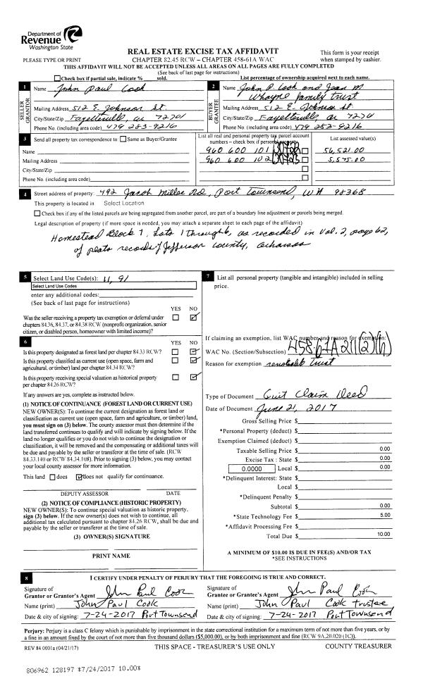 | 1 | 06/21/2017 | QCD | Quit Claim Deed | JOHN P COOK | JOHN P COOK & JEAN M WHAYNE FAMILY TRUST | | | | 128197 | |