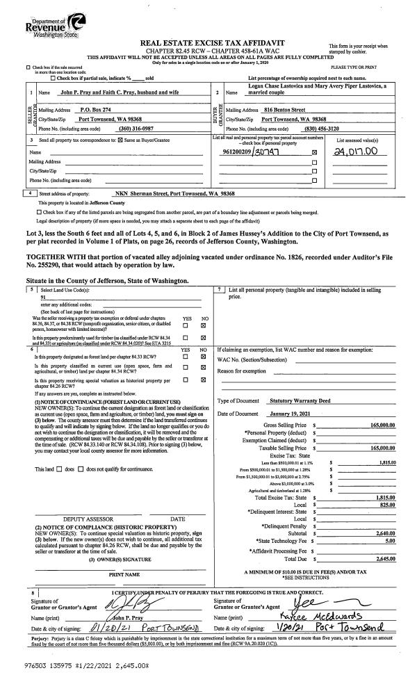 | 1 | 01/19/2021 | SWD | Statutory Warranty Deed | JOHN P & FAITH C PRAY | LOGAN C & MARY A P LASTOVICA | | | $165,000.00 | 135975 | |
