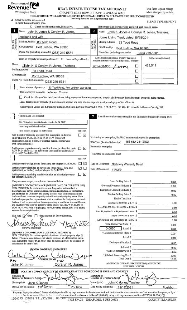 | 1 | 11/12/2021 | SWD | Statutory Warranty Deed | JOHN K & CORALYN R JONES | JONES LIVING TRUST | | | | 138092 | |