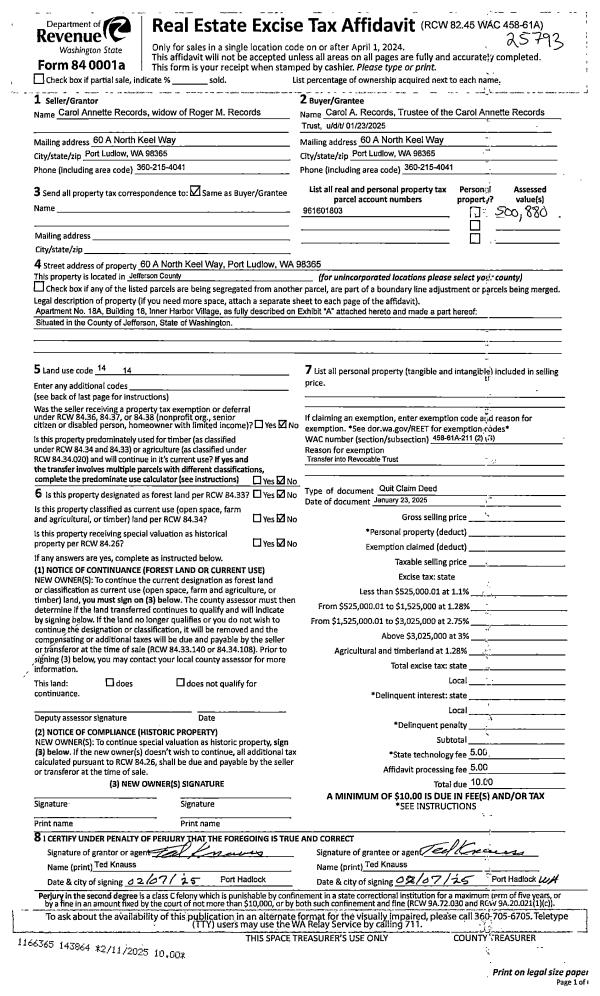 | 1 | 01/23/2025 | QCD | Quit Claim Deed | CAROL A RECORDS | CAROL A RECORDS TRUST | | | | 143864 | |