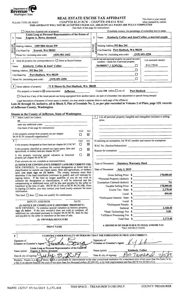 | 1 | 07/03/2019 | SWD | Statutory Warranty Deed | EUGENE HOWE | KIMBERLY & JOSEF COLLIER | | | $178,000.00 | 132717 | |