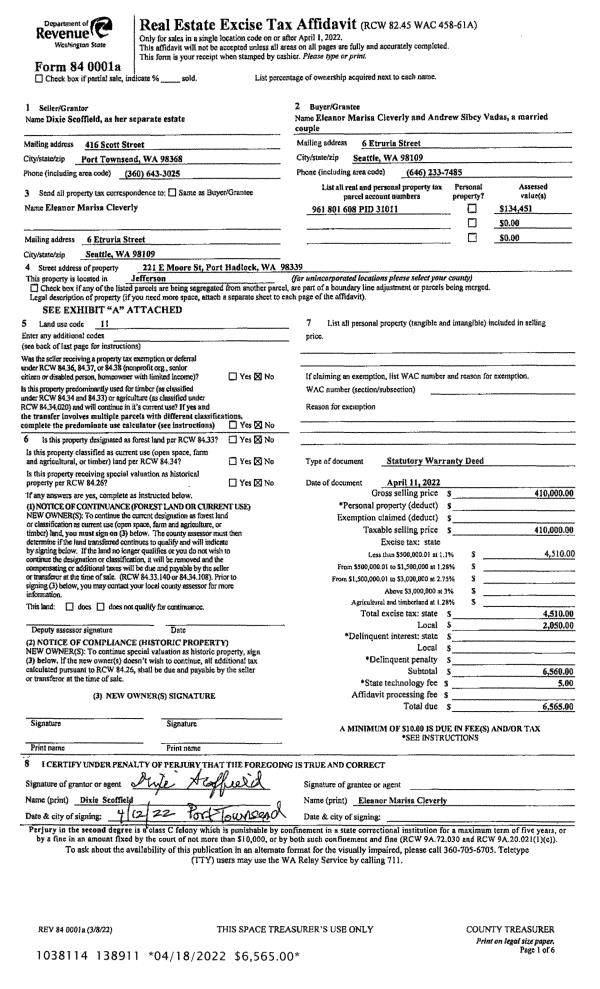 | 1 | 04/11/2022 | SWD | Statutory Warranty Deed | DIXIE SCOFFIELD | ELEANOR M CLEVERLY & ANDREW S VADAS | | | $410,000.00 | 138911 | |