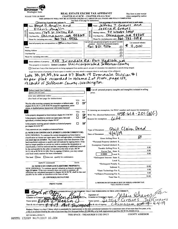 | 1 | 04/04/2019 | QCD | Quit Claim Deed | BOYD & ELLEN ANGLIN | JEFFREY GRAVES | | | | 132089 | |