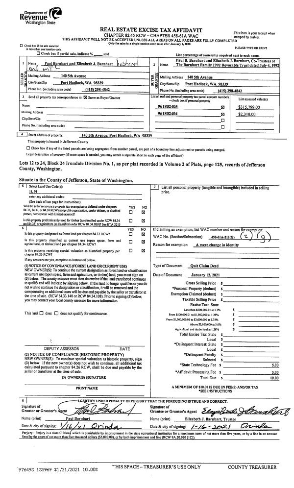 | 1 | 01/12/2021 | QCD | Quit Claim Deed | PAUL & ELIZABETH BARNHART | BARNHART FAMILY 1992 REVOC TRUST | | | | 135969 | |