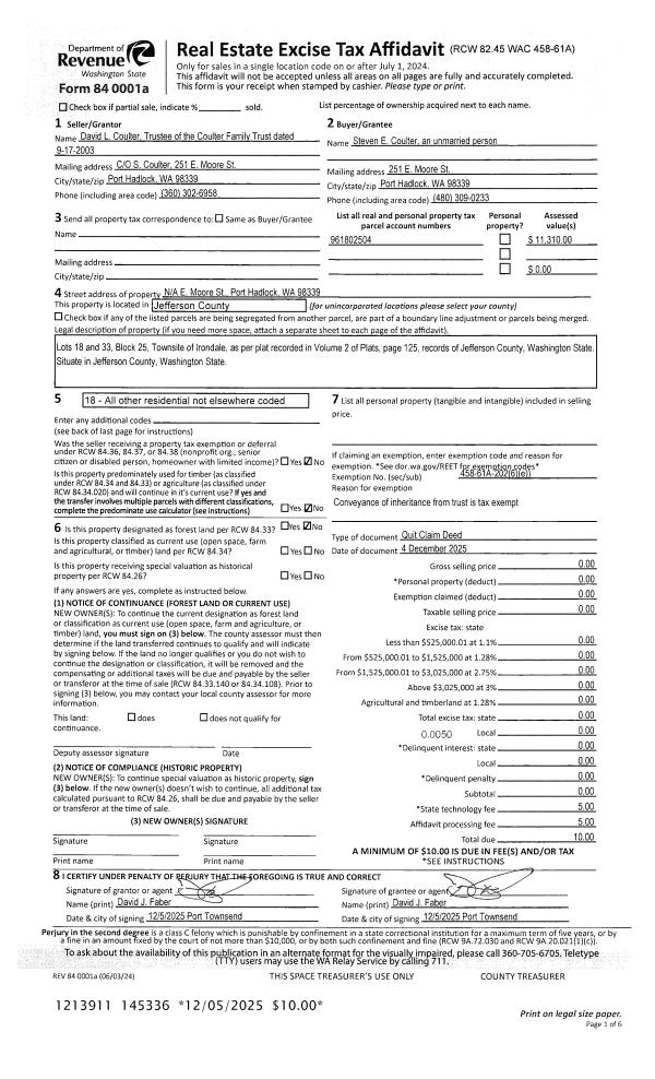 | 1 | 12/04/2025 | QCD | Quit Claim Deed | LAWRENCE COULTER TRUSTEE | STEVEN E COULTER | | | | 145336 | |
