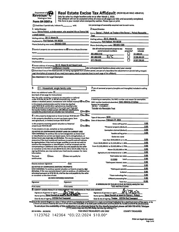 | 1 | 02/27/2024 | QCD | Quit Claim Deed | DONNA L POLLOCK | DONNA L POLLOCK REVOCABLE TRUST | | | | 142364 | |