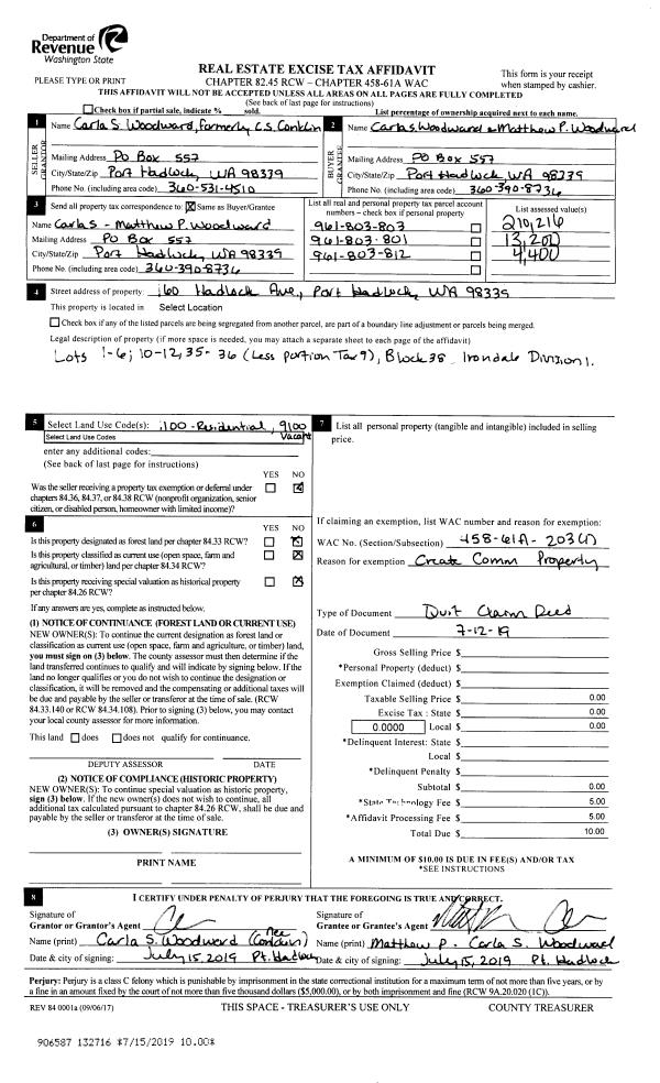 | 2 | 07/12/2019 | QCD | Quit Claim Deed | CARLA S CONKLIN | CARLA S & MATTHEW P WOODWARD | | | | 132716 | |