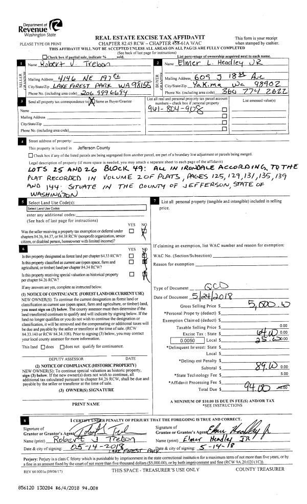 | 1 | 05/24/2018 | QCD | Quit Claim Deed | ROBERT J TREBON | ELMER L HEADLEY JR | | | $5,000.00 | 130284 | |