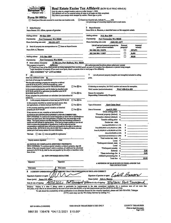 | 1 | 04/05/2021 | QCD | Quit Claim Deed | SUSAN J G ALBEE | ERIC A HANSON | | | | 136478 | |