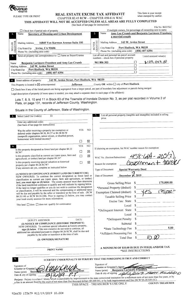| 1 | 12/13/2019 | SPWD | Special Warranty Deed | SECRETARY OF HOUSING & URBAN DEVELOPMENT | AMY CRUMB & BENJAMIN FRANDSEN | | | $175,000.00 | 133679 | |