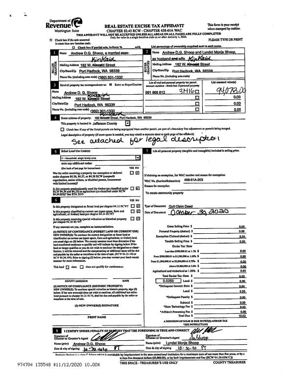 | 1 | 10/30/2020 | QCD | Quit Claim Deed | ANDREW D G SHOOP | ANDREW D G & LYNDEL M SHOOP | | | | 135548 | |