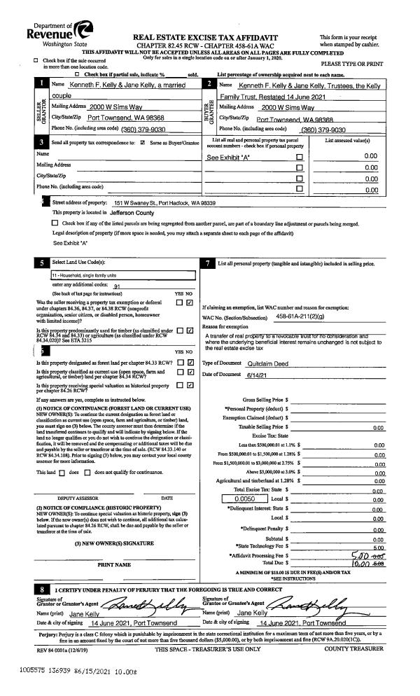 | 2 | 06/14/2021 | QCD | Quit Claim Deed | KENNETH & JANE KELLY | KELLY FAMILY TRUST | | | | 136939 | |