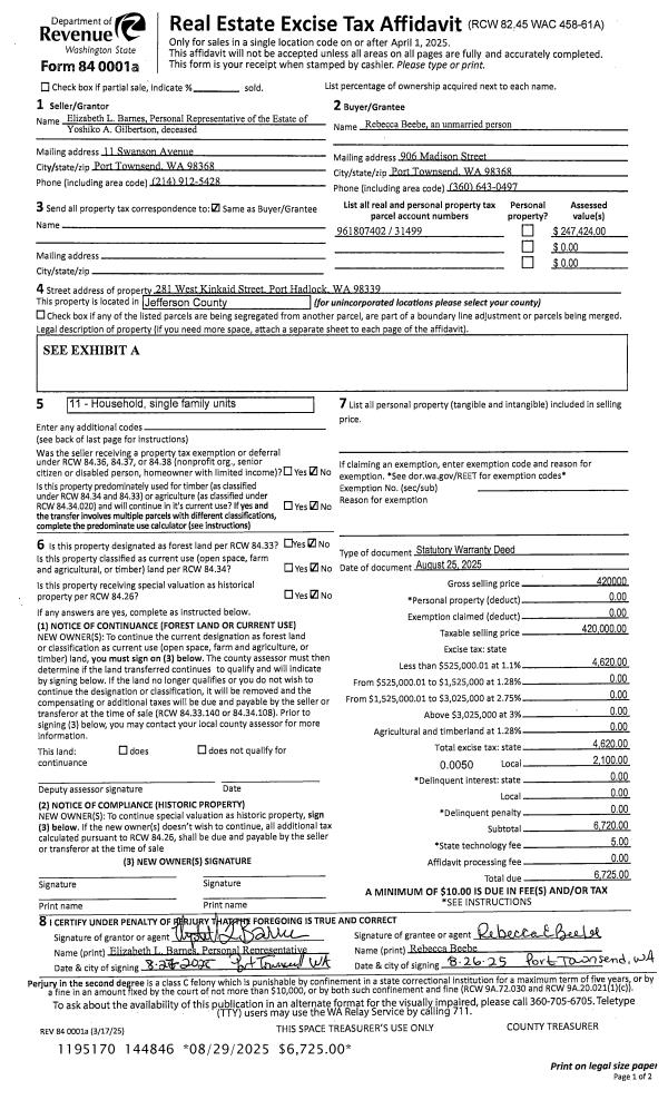 | 1 | 08/25/2025 | SWD | Statutory Warranty Deed | YOSHIKO GILBERTSON | REBECCA BEEBE | | | $420,000.00 | 144846 | |