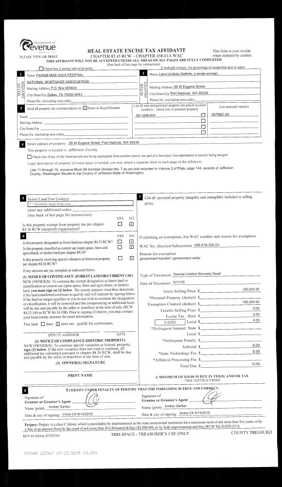| 1 | 09/11/2015 | SLWD | Special Limited Warranty Deed | FEDERAL NATIONAL MORTGAGE ASSOCIATION | LANA LINDSEY-GUTHRIE | | | $185,000.00 | 123967 | |
