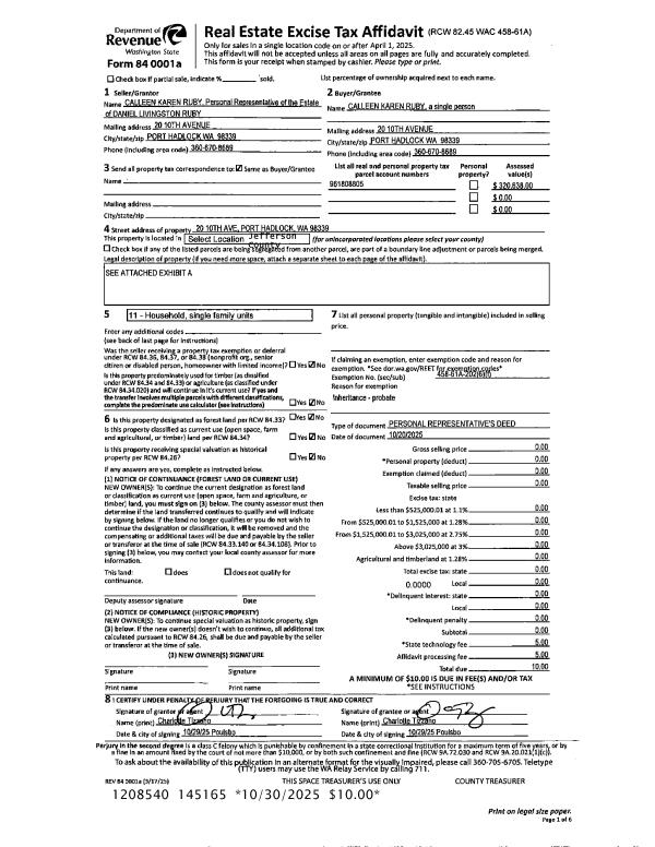 | 1 | 10/20/2025 | PRD | Personal Representatives Deed | DANIEL L RUBY | CALLEEN K RUBY | | | | 145165 | |