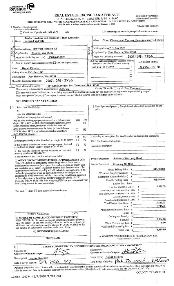 | 2 | 02/28/2020 | SWD | Statutory Warranty Deed | JASCHA KOZELISKY | GRANT & VANESSA CLEMENS | | | $349,000.00 | 134074 | |