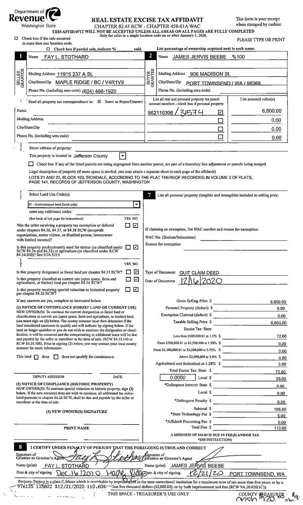 | 1 | 12/16/2020 | QCD | Quit Claim Deed | FAY L STOTHARD | JAMES J BEEBE | | | $6,600.00 | 135802 | |