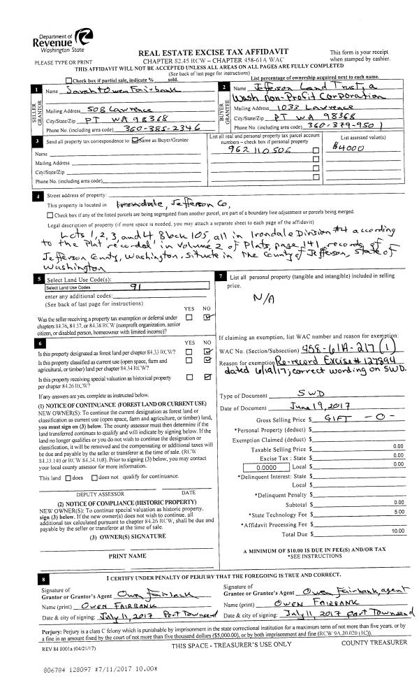 | 2 | 06/19/2017 | SWD | Statutory Warranty Deed | OWEN FAIRBANK | JEFFERSON LAND TRUST | | | | 127894 | |