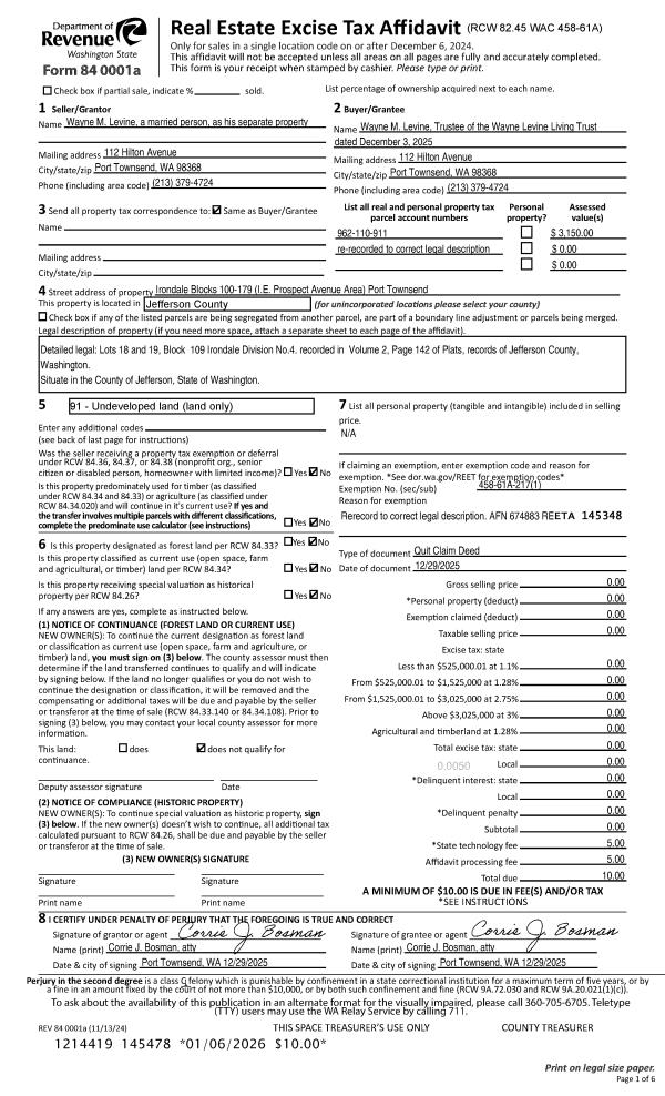 | 1 | 12/29/2025 | QCD | Quit Claim Deed | WAYNE M LEVINE | WAYNE LEVINE LIVING TRUST | | | | 145478 | RERECORD |
