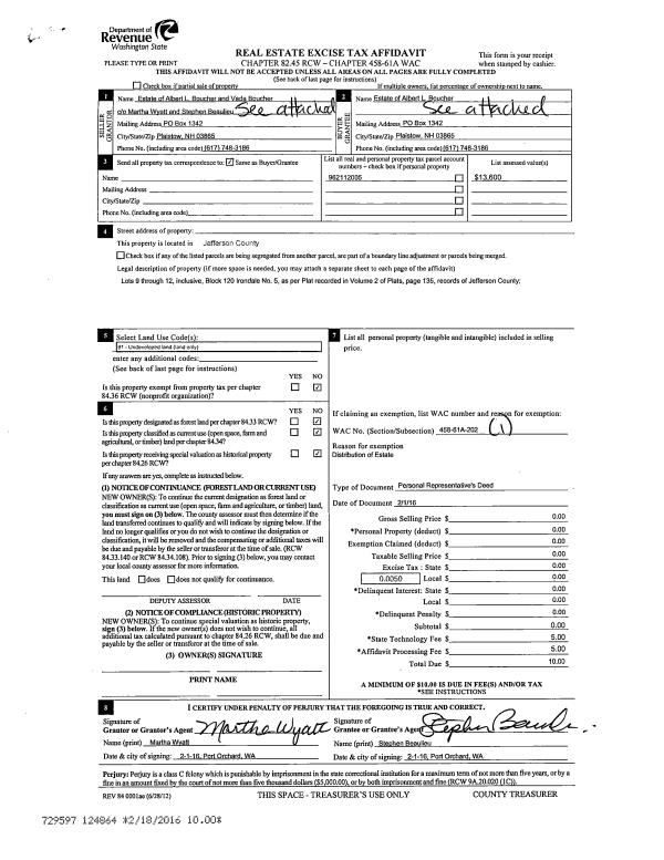 | 6 | 08/11/2017 | PRD | Personal Representatives Deed | MARTHA WYATT & STEPHEN BEAULIEU | ESTATE OF MILDRED T BOUCHER | | | | 128485 | |