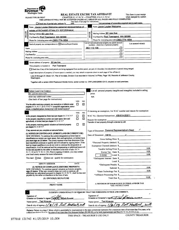 | 1 | 01/08/2019 | PRD | Personal Representatives Deed | RICHARD S SZCZEPANIK | JOYCE L WELCOME | | | | 131743 | |