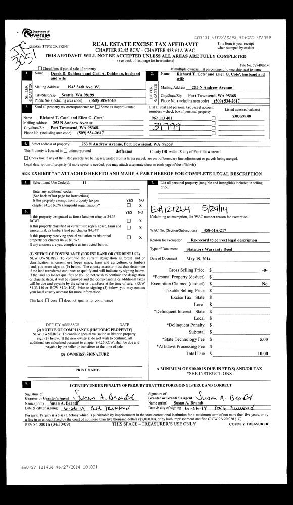 | 3 | 05/19/2014 | SWD | Statutory Warranty Deed | DEREK & GAIL DAHLMAN | RICHARD T & ELLEN G COTE | | | $288,000.00 | 121264 | |
