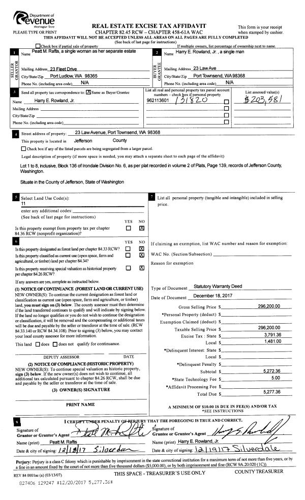 | 1 | 12/18/2017 | SWD | Statutory Warranty Deed | PEATT RAFTIS | HARRY E ROWLAND JR | | | $296,200.00 | 129247 | |