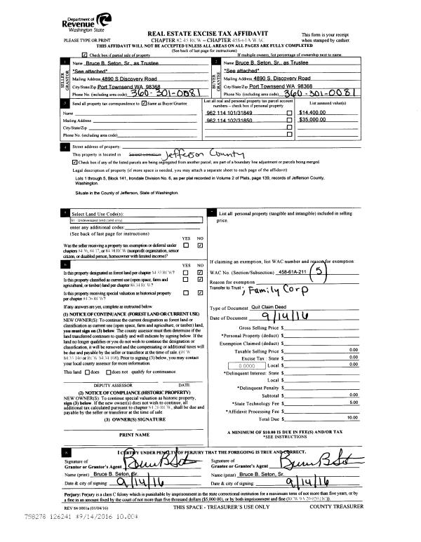 | 6 | 09/14/2016 | QCD | Quit Claim Deed | W E SETON & MARILYN SETON RECOVABLE TRUST | | | | | 126241 | |