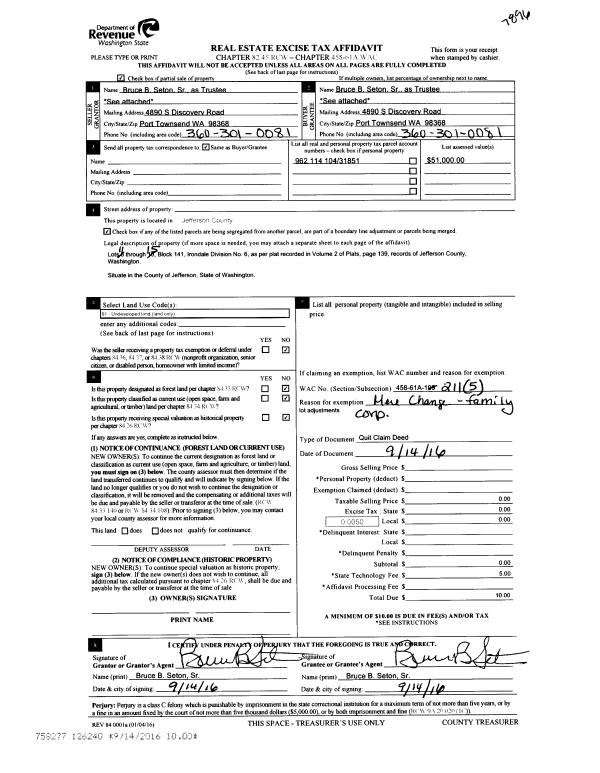 | 5 | 09/14/2016 | QCD | Quit Claim Deed | W E SETON & MARILYN SETON RECOVABLE TRUST | | | | | 126240 | |
