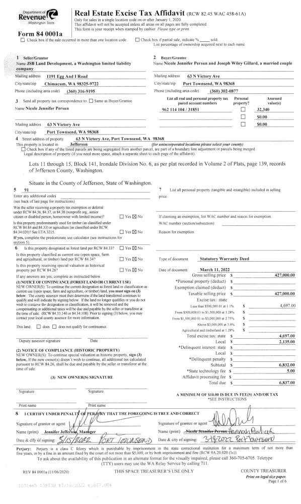 | 1 | 03/11/2022 | SWD | Statutory Warranty Deed | JSB LAND DEVELOPMENT LLC | NICOLE J PERSUN & JOSEPH W GILLARD | | | $427,000.00 | 138730 | |