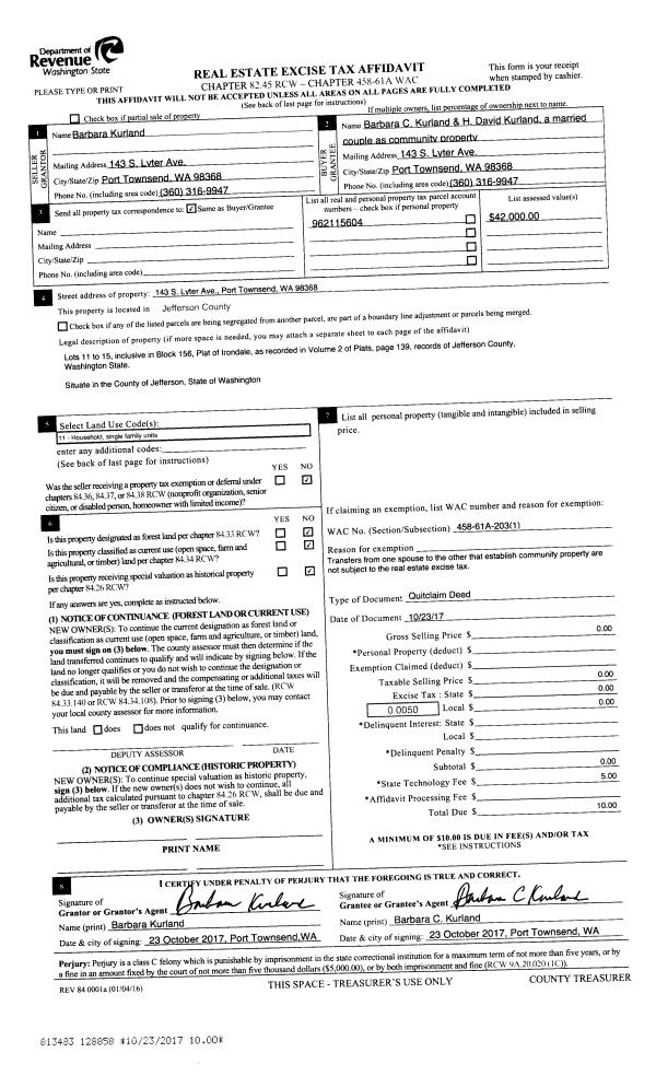 | 2 | 10/23/2017 | QCD | Quit Claim Deed | BARBARA KURLAND | BARBARA C & H DAVID KURLAND | | | | 128858 | |