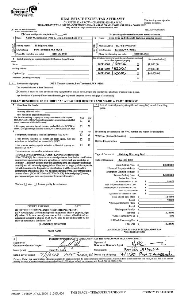 | 1 | 06/25/2020 | SWD | Statutory Warranty Deed | CASEY M & IRENE L DOLAN | GENE RYAN & ELIZABETH IAUKEA | | | $140,000.00 | 134589 | |