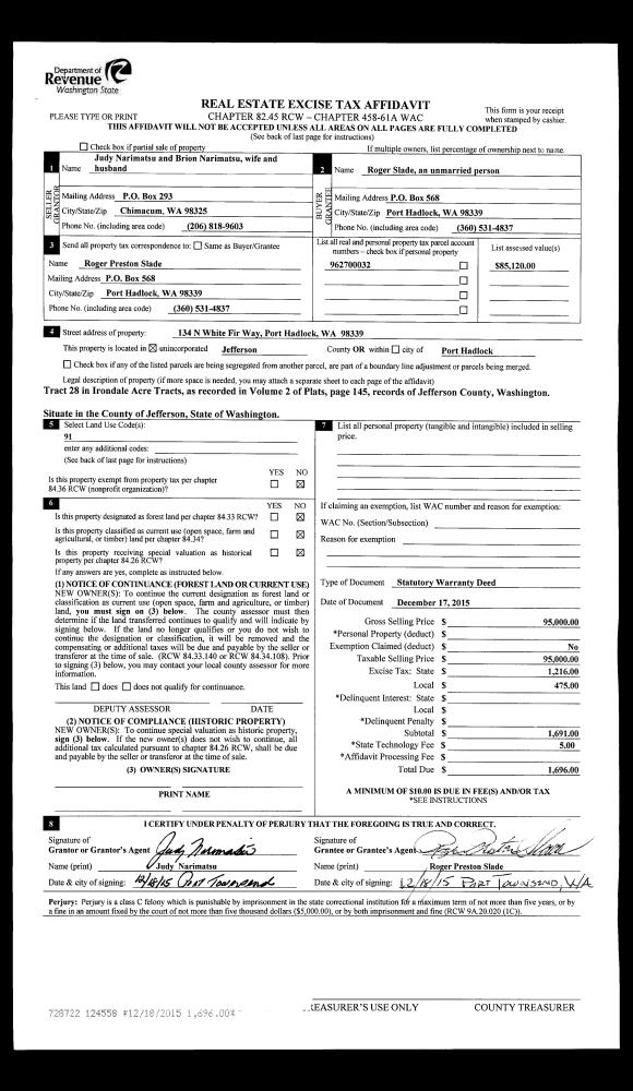 | 1 | 12/17/2015 | SWD | Statutory Warranty Deed | JUDY & BRION NARIMATSU | ROGER SLADE | | | $95,000.00 | 124558 | |