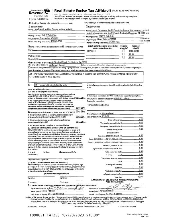 | Mailing Address: | LARRY J & ANN N PANUSH TRUSTEES 40 CLEVELAND ST PORT HADLOCK, WA 98339-9712 | % Ownership: | 100.0000000000% |