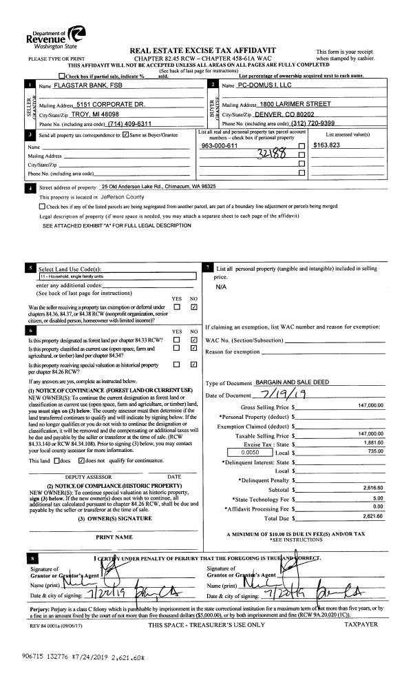 | 3 | 07/19/2019 | BSD | Bargain and Sale Deed | FLAGSTAR BANK FSB | PC DOMUS I LLC | | | $147,000.00 | 132776 | |