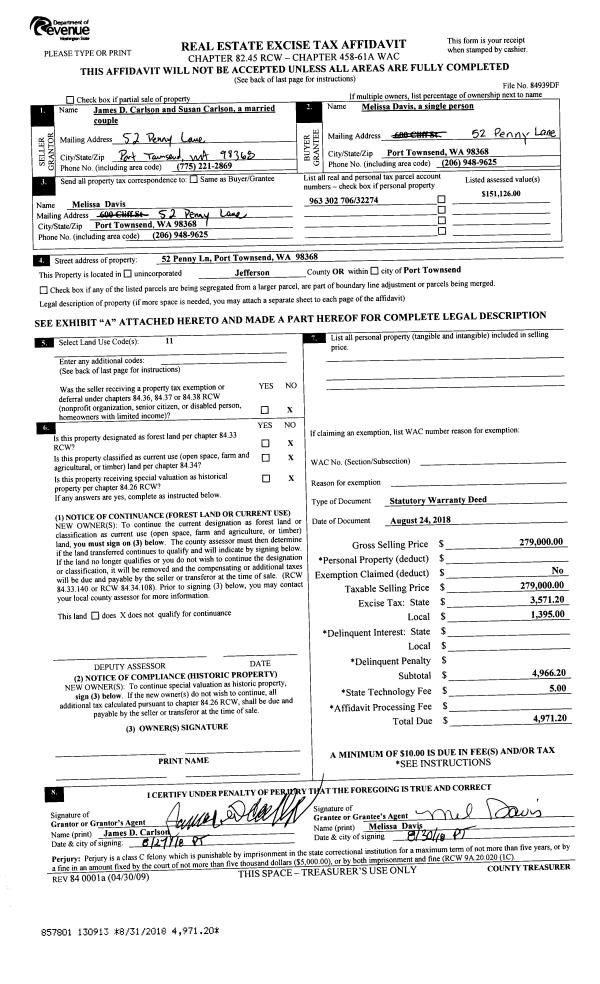 | 1 | 08/24/2018 | SWD | Statutory Warranty Deed | JAMES D CARLSON | MELISSA DAVIS | | | $279,000.00 | 130913 | |