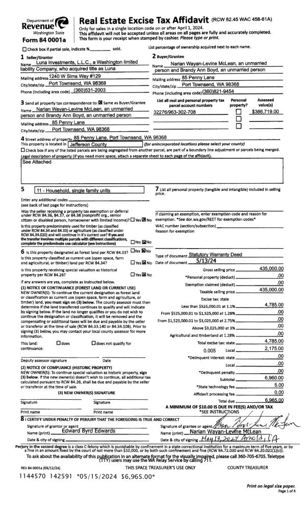 | 1 | 05/13/2024 | SWD | Statutory Warranty Deed | LUNA INVESTMENTS LLC | NARIAN WAYAN-LEVINE MCLEAN | | | $435,000.00 | 142591 | |