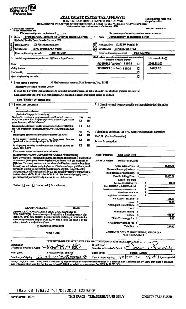 | Mailing Address: | CATHERINE & FRANK MCNABB TRUSTEES 100 MEDITERANEAN ST PORT TOWNSEND, WA 98368-9683 | % Ownership: | 100.0000000000% |