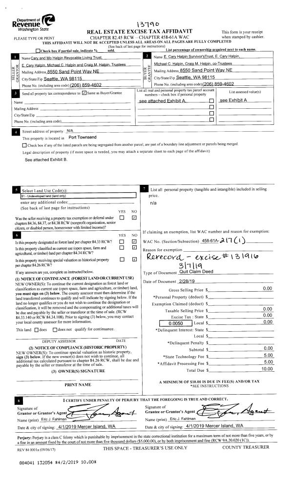 | 7 | 02/28/2019 | QCD | Quit Claim Deed | CARY & MO HALPIN REVOCABLE LIVING TRUST | E CARY HALPIN SURVIVORS TRUST | | | | 131916 | |