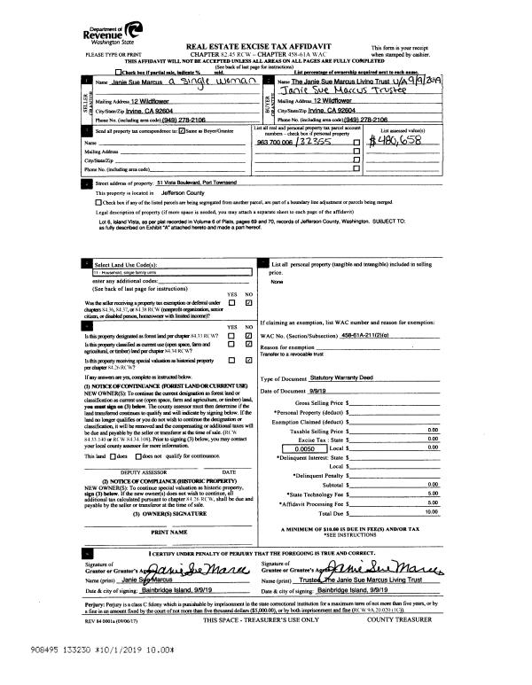 | 3 | 09/09/2019 | SWD | Statutory Warranty Deed | JANIE S MARCUS | JANIE SUE MARCUS LIVING TRUST | | | | 133230 | |
