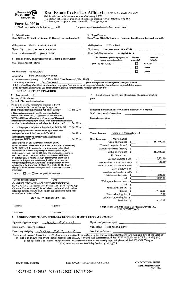 | 1 | 05/24/2023 | SWD | Statutory Warranty Deed | SANDRA R HAROLD | JAMESON J & TIANA M HAWN | | | $565,000.00 | 140987 | |