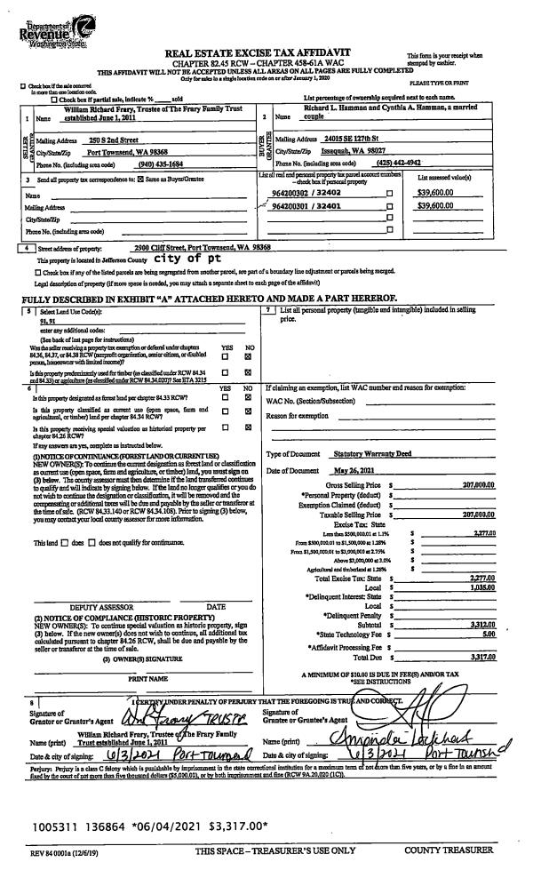 | 1 | 05/26/2021 | SWD | Statutory Warranty Deed | FRARY FAMILY TRUST | RICHARD L & CYNTHIA A HAMMAN | | | $207,000.00 | 136864 | |