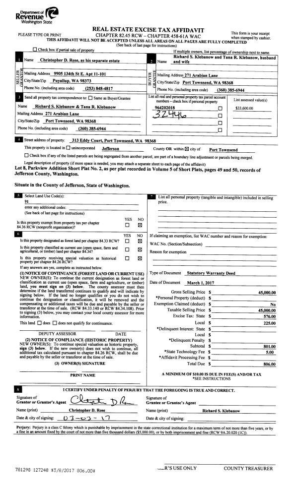 | 4 | 03/01/2017 | SWD | Statutory Warranty Deed | CHRISTOPHER D ROSE | RICHARD S KLEBANOW | | | $45,000.00 | 127248 | |