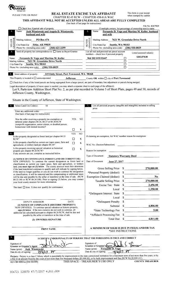| 2 | 06/27/2017 | SWD | Statutory Warranty Deed | JOSH WISNIEWSKI | FERNANDO VEGA & MARTINA KOLLER | | | $270,000.00 | 128070 | |