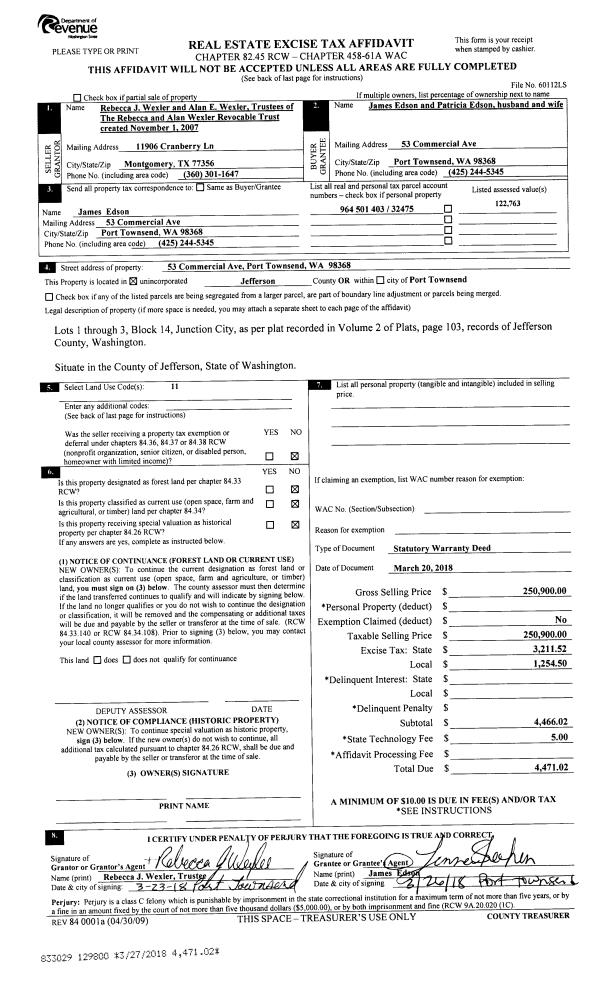 | 1 | 03/20/2018 | SWD | Statutory Warranty Deed | REBECCA J WEXLER TRSTEE | JAMES & PATRICIA EDSON | | | $250,900.00 | 129800 | |