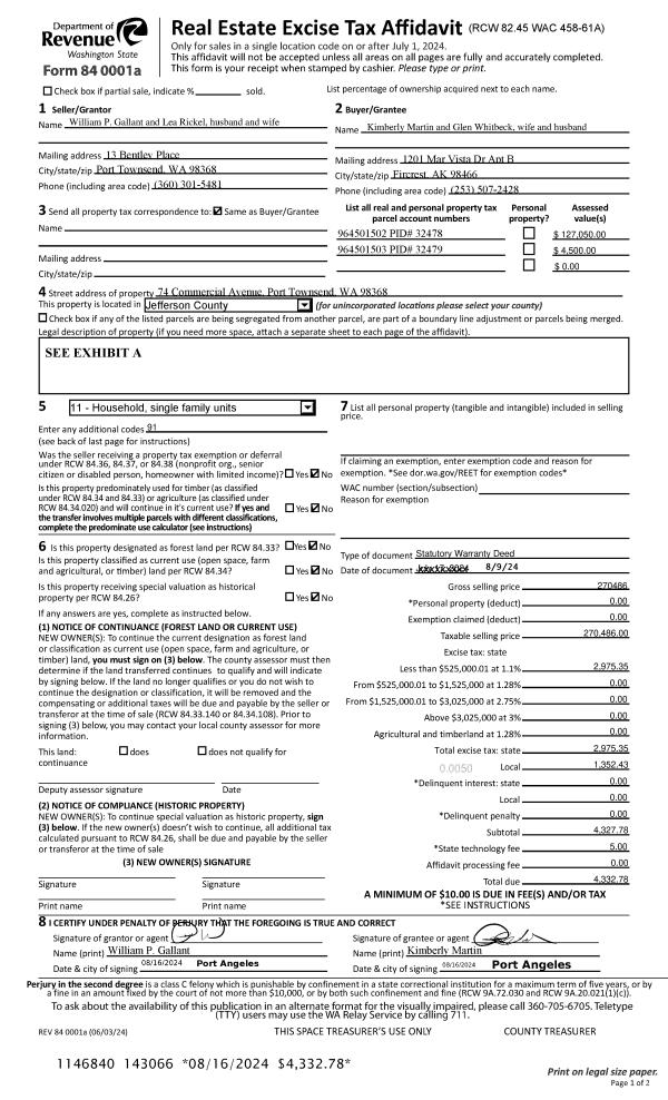 | 1 | 08/09/2024 | SWD | Statutory Warranty Deed | WILLIAM P GALLANT & LEA RICKEL | KIMBERLY MARTIN | | | $270,486.00 | 143066 | |
