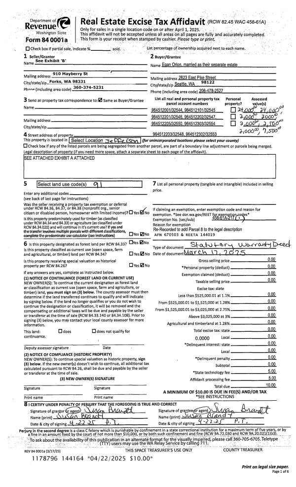 | 1 | 03/17/2025 | SWD | Statutory Warranty Deed | | EGAN ORION | | | | 144164 | RERECORD |