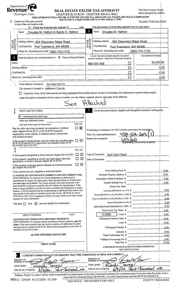 | 3 | 06/03/2020 | QCD | Quit Claim Deed | DOUG & SANDY HATHON | DOUGLAS M HATHON | | | | 134428 | |